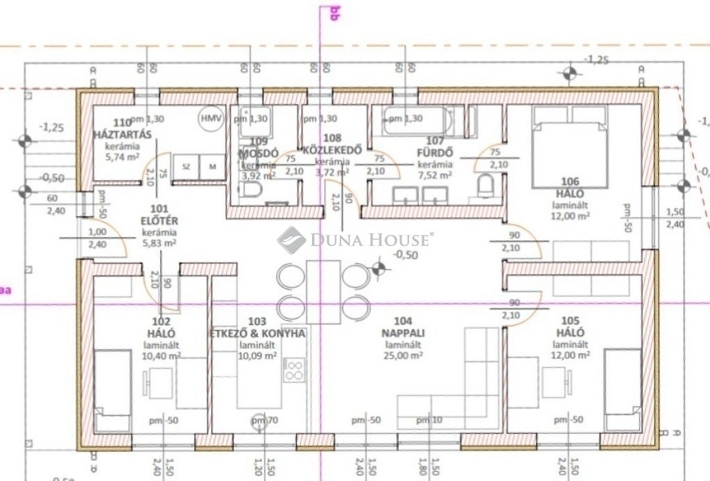 A fűtést hőszivattyú biztosítja padlófűtéssel, puffertartályos rendszerleválasztással.