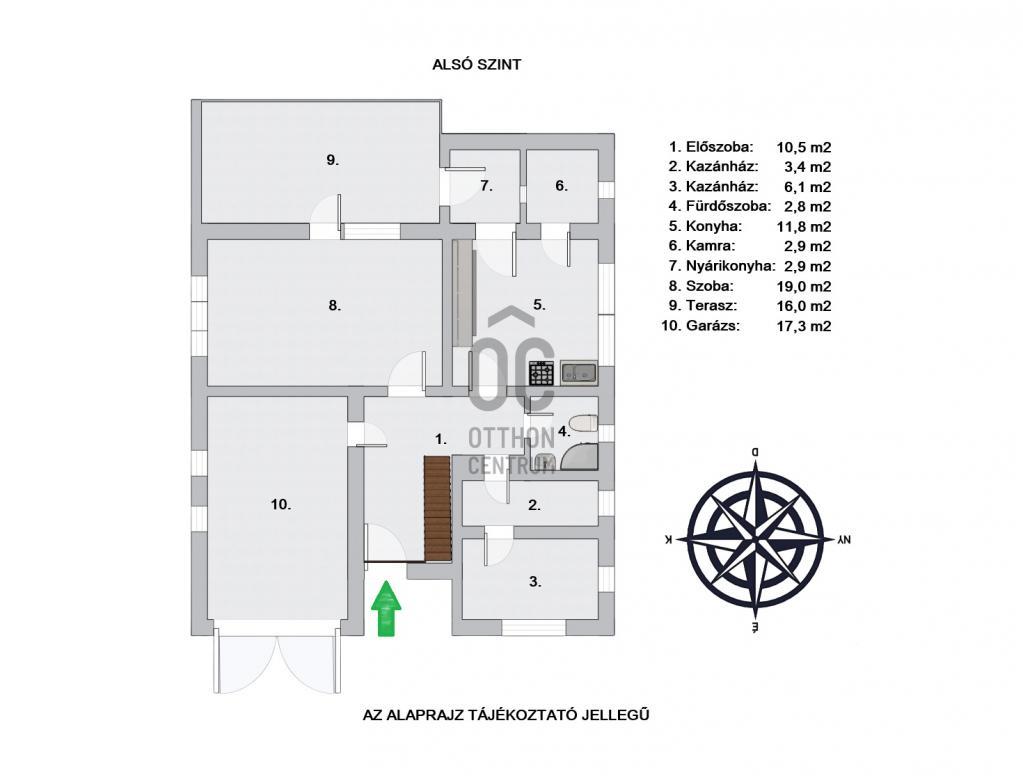 - A földszint felosztása: előszoba, 1 szoba, konyha, kamra, fürdőszoba-wc, 2 kazánház, egyéb tároló helyiség, terasz, garázs.