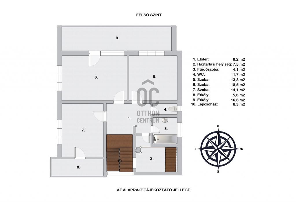 - Az emeleti szobák közül egy déli, egy déli és keleti, egy pedig keleti és északi tájolású.