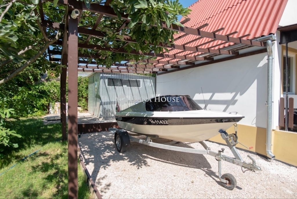 Az udvaron található egy garázs, egy lugas és egy szalonnasütő.A vízellátás vezetékes vízről történik, de van egy fúrt kút is házi vízművel, amire akár a locsolót is rá lehet kötni.