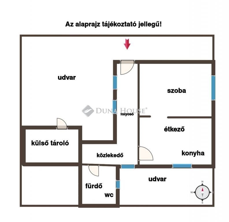 Az első kapu közvetlenül a házhoz és egy kis udvarrészhez vezet. Belépve egy folyosóra érkezünk, jobb oldalon található a fürdőszoba, balra a konyha, továbbhaladva pedig a szobába jutunk.