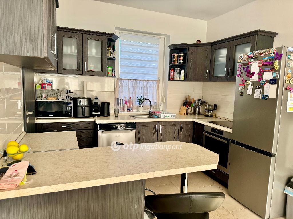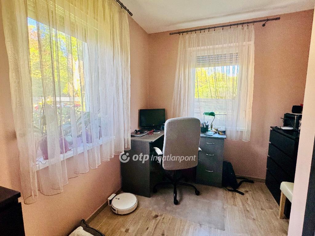 A belső elrendezés az átláthatóságra és életszerű használatra épül: a tágas, amerikai konyhás nappali köré szerveződnek a helyiségek; három félszoba, külön előszoba, spájz és gépészeti helyiség, tágas fürdőszoba és külön WC adja a mindennapok kényelmét. A ház előtt fedett, térkövezett beálló két autót fogad, emellett egy körülbelül 15 négyzetméteres, jelenleg tárolóként használt garázs is rendelkezésre áll. A kert kifejezetten könnyen karbantartható, teljesen körbekerített és praktikusan használható.