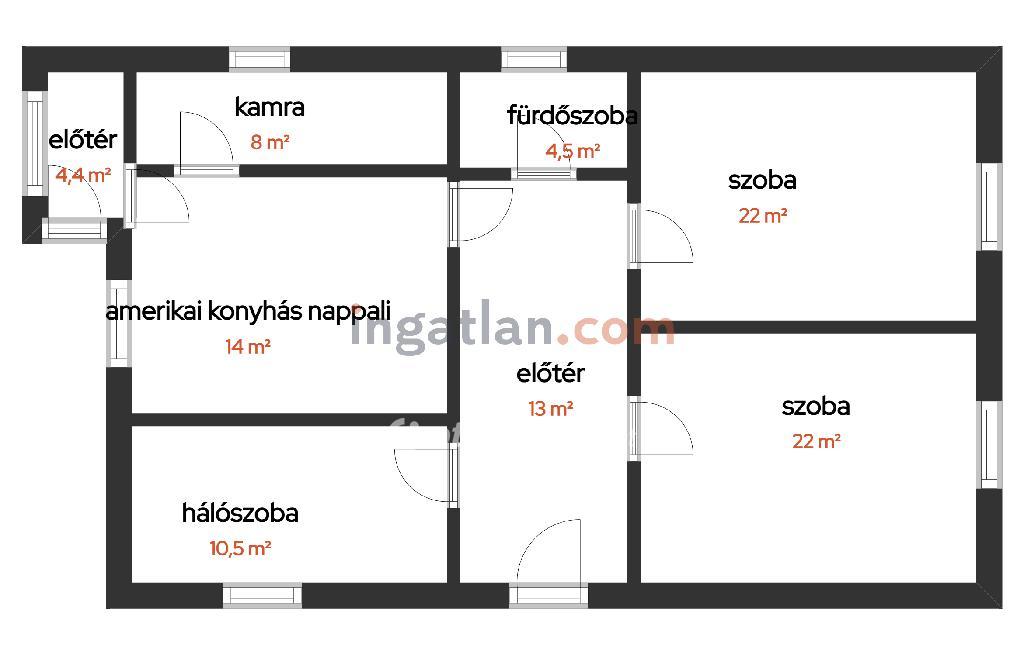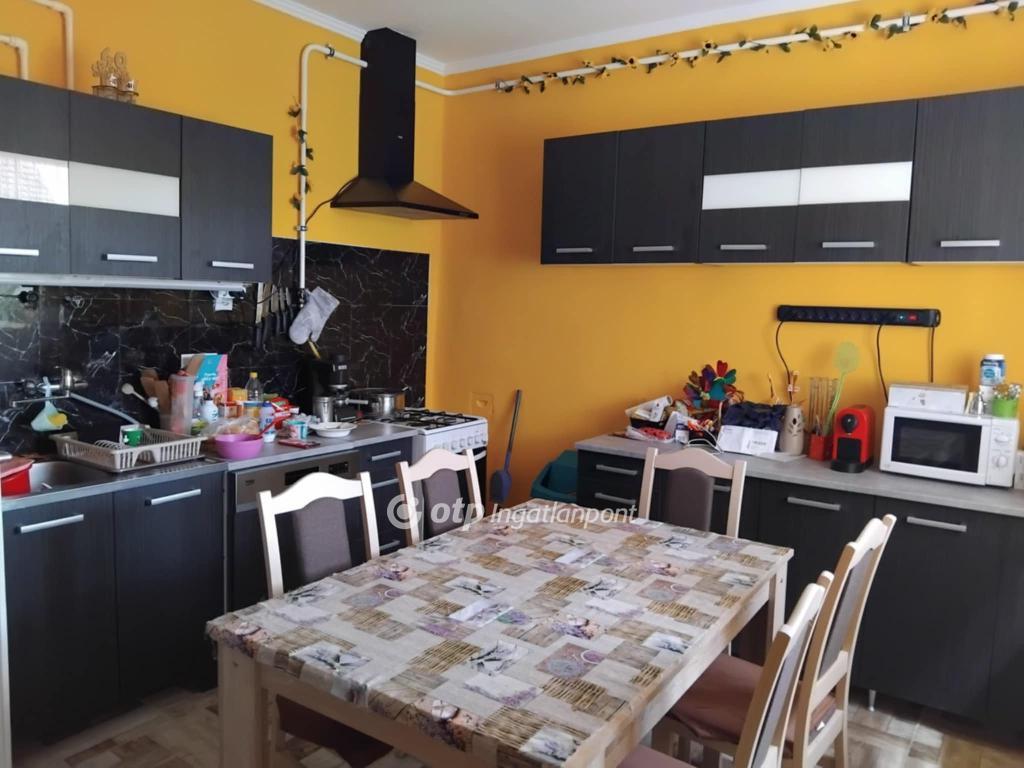 Helyiségek: előszoba, 2 szoba+1 félszoba, amerikai konyhás nappali, nagy méretű kamra, előtér, fürdőszoba (WC-vel egyben).