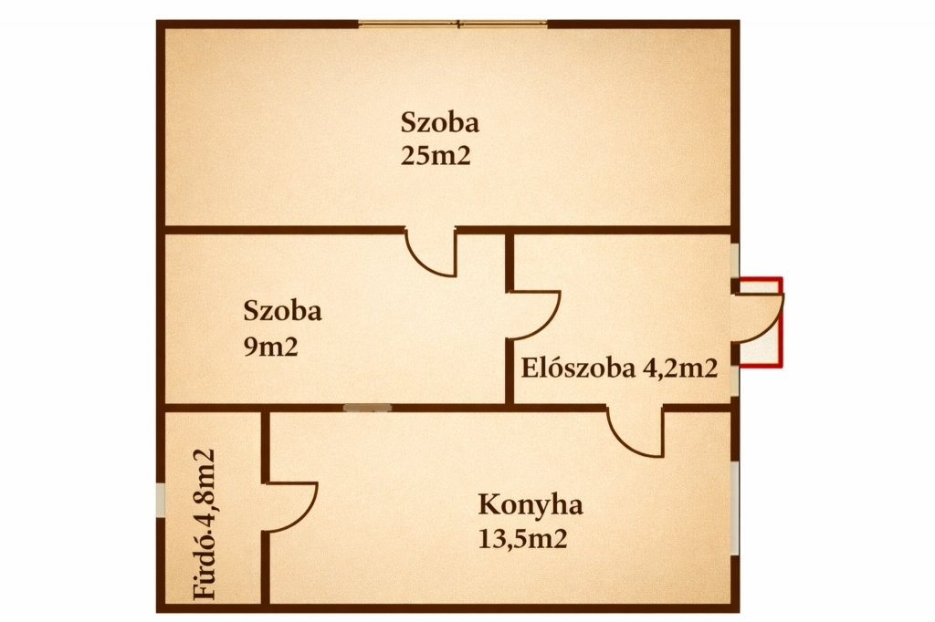 Helyiségek: 1 szoba + 1 félszoba, konyha, fürdőszoba
