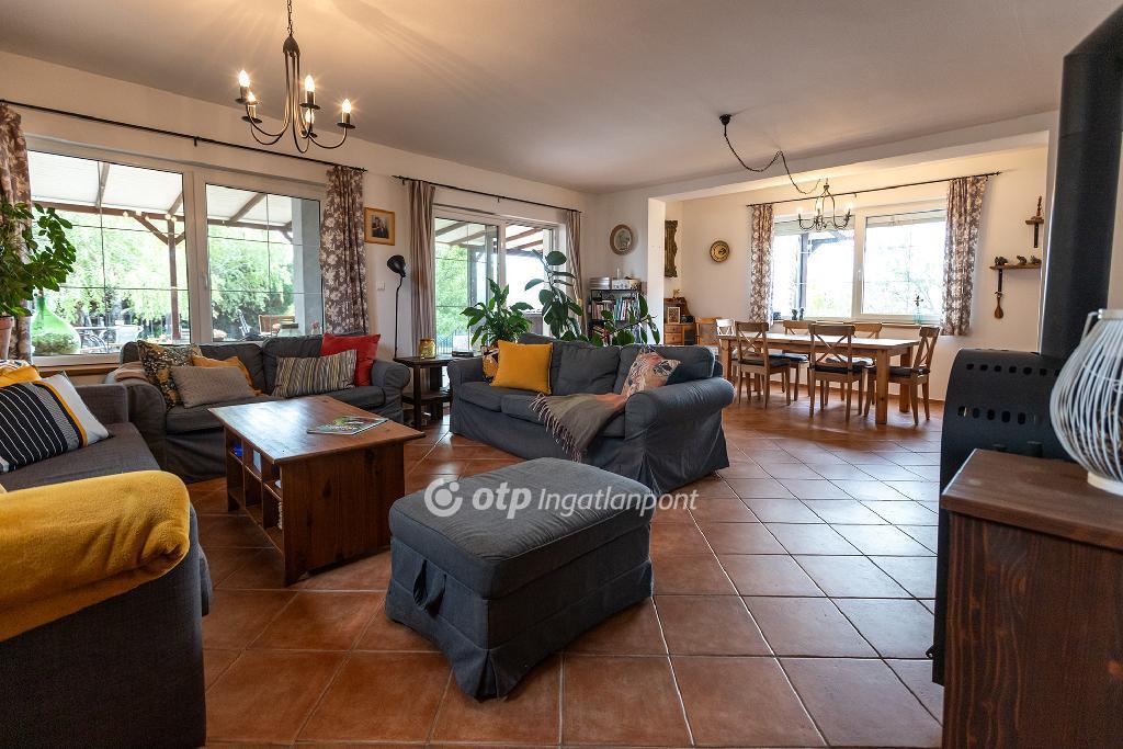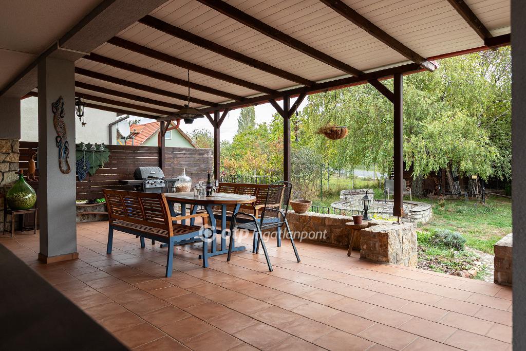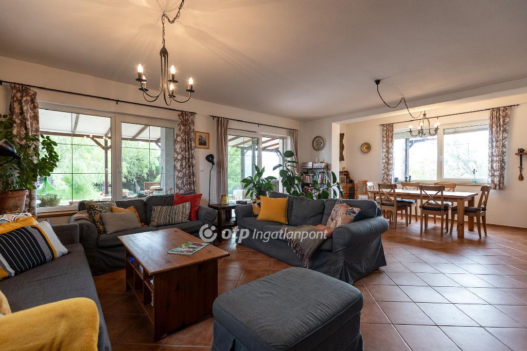 A tágas, amerikai konyhás nappali a ház központja természetes fényben úszik, és közvetlen kapcsolatban áll a fedett, 60m2-es hangulatos terasszal, amely a társasági élet színtere lehet tavasztól késő őszig.
