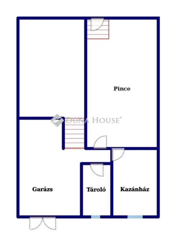 A pinceszinten található a fűthető garázs, egy kisebb tároló helyiség, a kazánház fatárolóval és a pince helyiség, ahonnan külön ajtó vezet a kertbe. A pinceszintről lépcső vezet fel a lakórészbe.