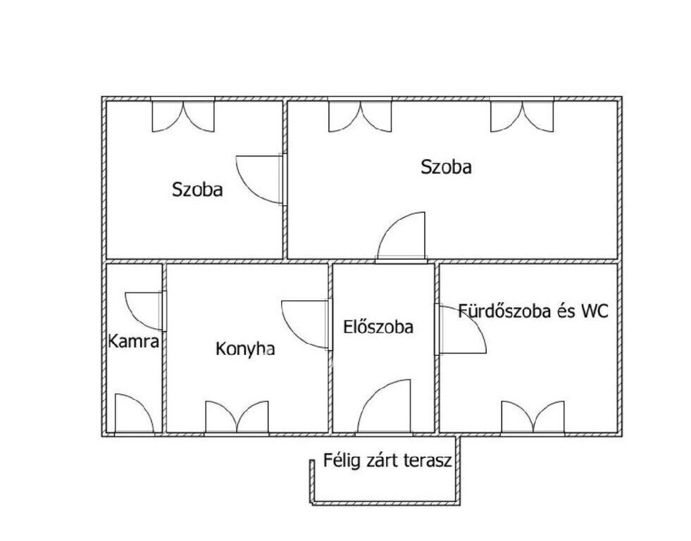 A ház 2 szoba, előszoba, kamra, konyha, fürdőszoba és WC (egyben) valamint félig zárt terasz helyiségekből áll.