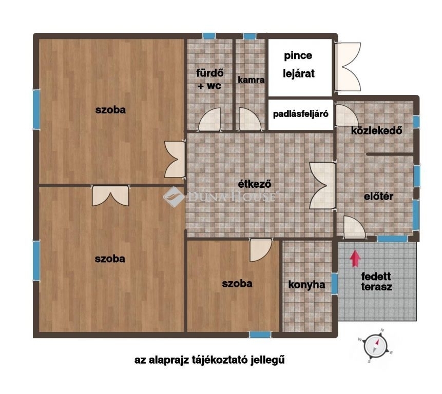 A ház földszinti helyiségei- előtér- konyha- étkező- fürdőszoba WC-vel- 2 nagy szoba- 1 kisebb szoba- közlekedő- padlásfeljáróA tetőtér beépíthető, amely a jövőben további lakóteret biztosíthat. Az oldalsó ablak és a tetőablakok már kialakításra kerültek.
