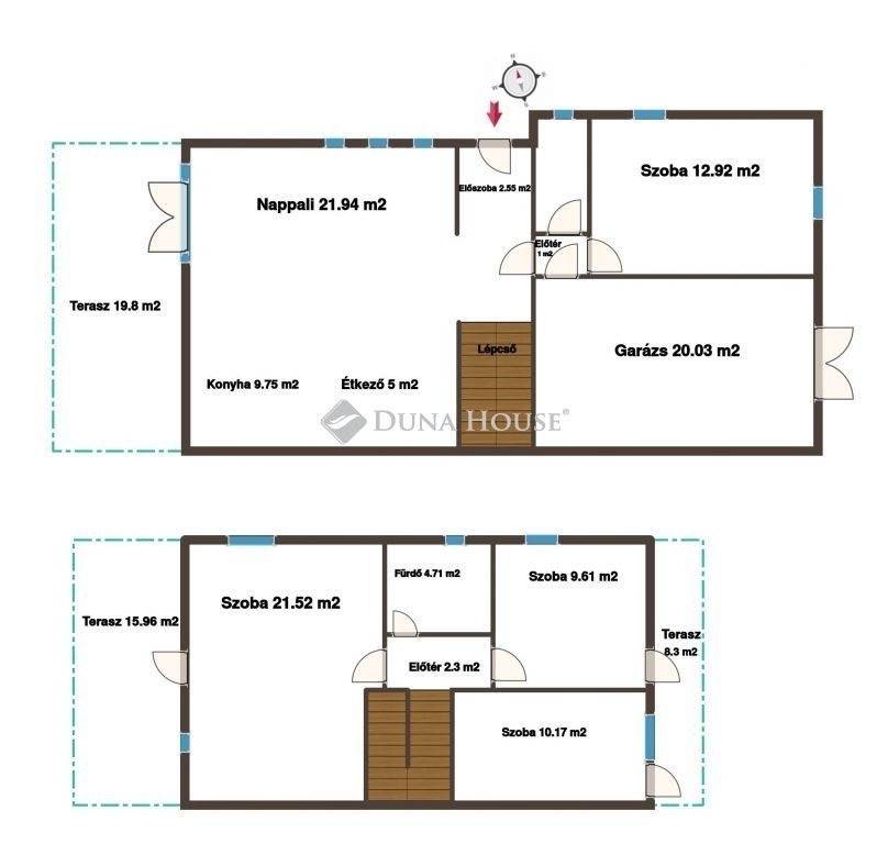 Földszint – a közösségi élet tere: A bejáraton belépve egy tágas előszoba fogadja, ahonnan a világos, 21,94 m²-es nappaliba léphetünk. A nappali közvetlen kapcsolatban áll a 9,75 m²-es konyhával és az étkezővel, így a családi élet minden pillanata egy légtérben, mégis jól szeparálhatóan zajlhat. A földszinten található továbbá egy kényelmes, 20,03 m²-es garázs, amelyből közvetlen bejárás biztosított a lakótérbe, valamint egy háztartási helyiség és vendégmosdó. A nappaliból kilépve egy 18,00 m²-es terasz biztosítja a kertkapcsolatot.