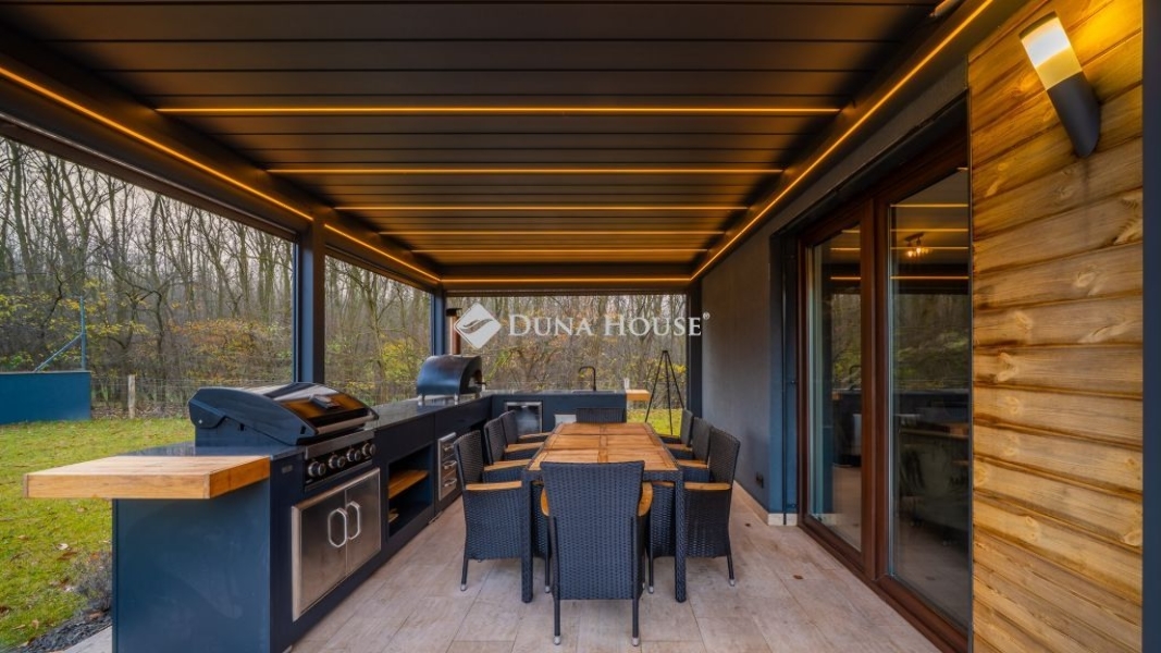 A fedett, távirányítóval zárható, motoros screenelős bioklimatikus pergola alatt helyezkedik el a Grillandia felsőkategóriás kültéri konyha gázgrillel, pizzasütő kemencével, beépített hűtőkkel, tárolókkal és márványmunkapulttal. Az automata öntözőrendszerrel karbantartott kert diszkrét intimitást biztosít.