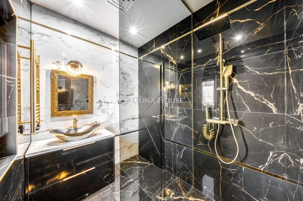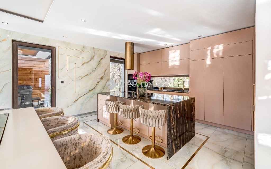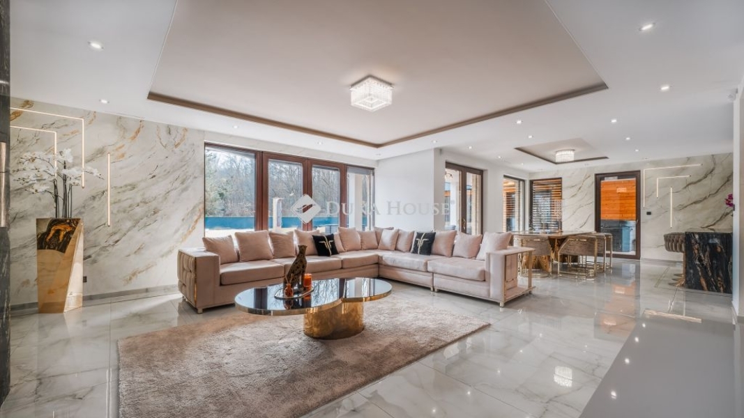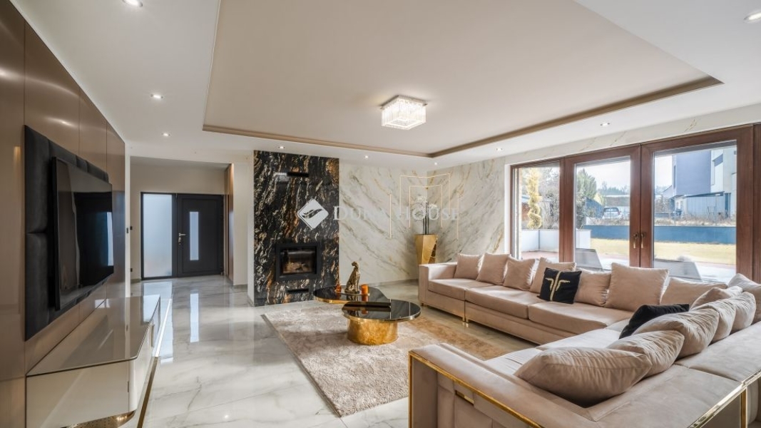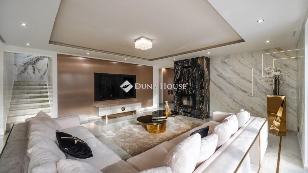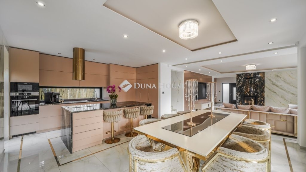 Az óriási üvegfelületekkel megnyitott nappali-étkező-konyha tér a kertre és a medencére nyílik. A konyha márványpulttal és prémium gépparkkal felszerelt. Nagyformátumú kőburkolatok, dizájn LED-világítás, vízteres kandalló és egyedileg gyártott prémium beltéri ajtók emelik az otthon esztétikáját.
