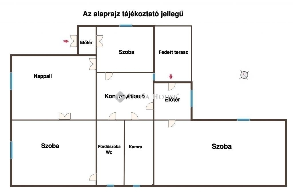 Az ingatlanban kialakításra került három szoba, egy nappali, konyha étkezővel, kamra és egy fürdő wc-vel.
