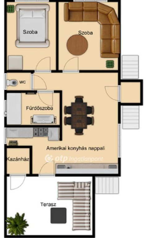 -kedvező fekvéséből eredően világos , kiváló elosztású beltérrel találkozunk amelyben : 2 szoba , amerikai konyhás nappali , közlekedő , fürdőszoba és külön wc , kívülről megközelíthető kazánház és terasz kerűlt kialakításra.