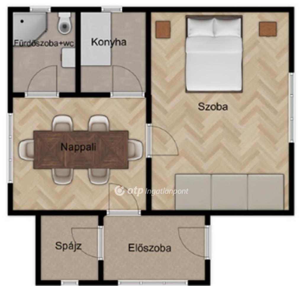 -a világos beltérben : előszoba , szoba , nappali , konyha , spájz , fürdőszoba+wc kapott helyett.