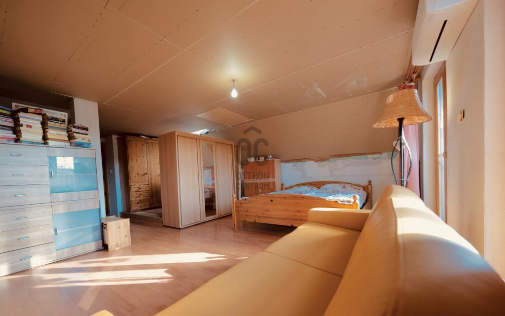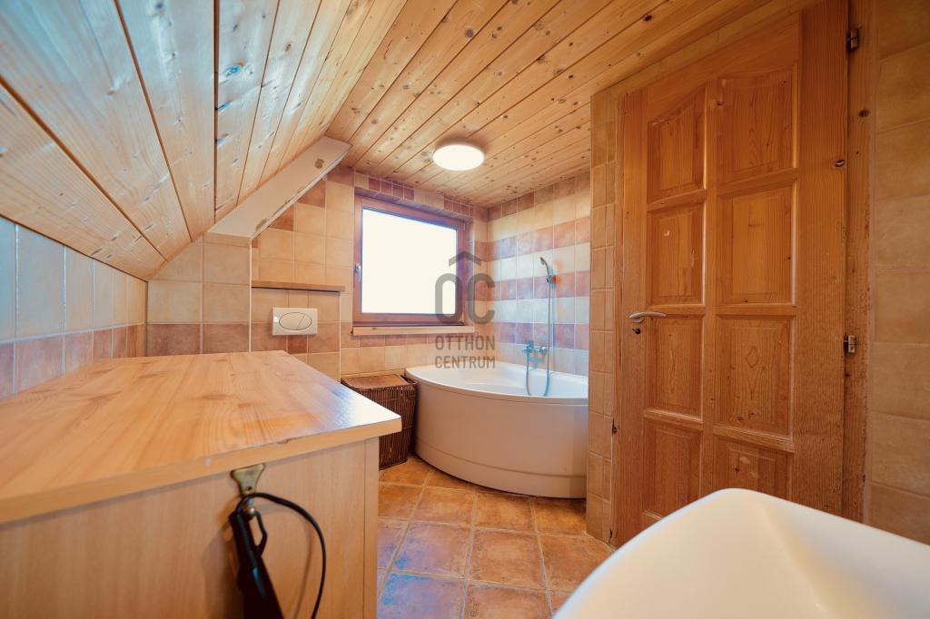 -emelet helyiségei: egy nagy világos nappali, hálószoba, dolgozó szoba, fürdőszoba-fürdőkáddal kapott helyet