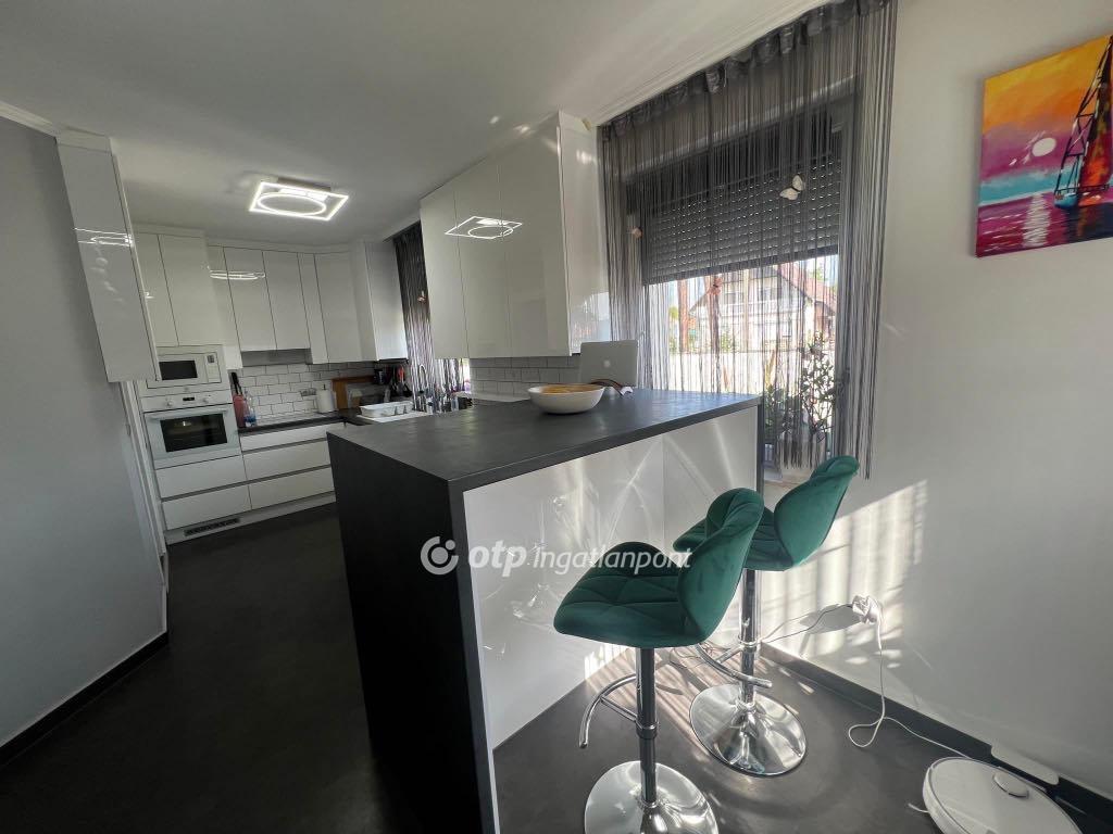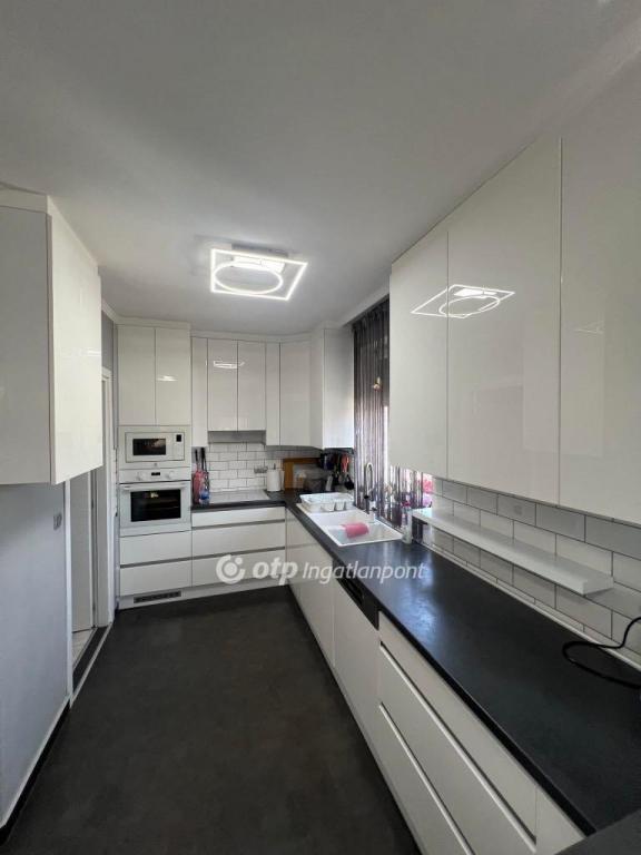 A konyha: modern, letisztult, fehér fényes szekrényekkel ellátott, beépített elektromos sütővel és mikrohullámú sütővel, amely elegáns megjelenést biztosít.