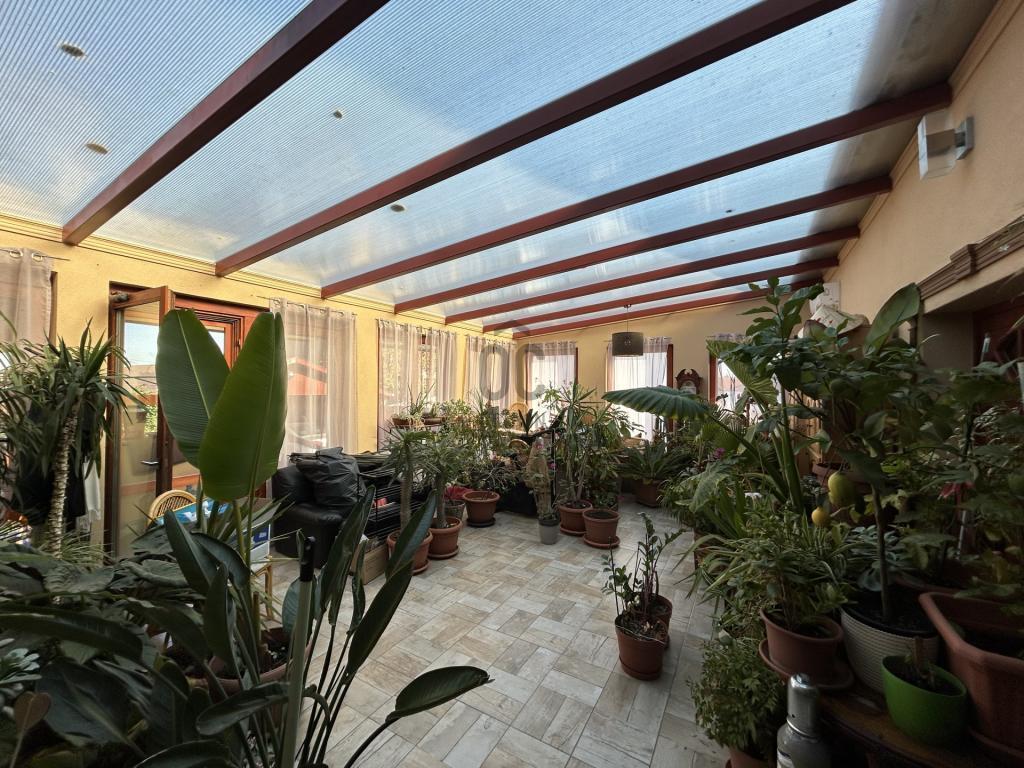 A fedett terasz elképesztően hatalmas – tökéletes helyszín egy hangulatos reggelihez a napfényben, vagy egy meghitt esti pihenéshez a csillagok alatt. Akár botanikus kertként, akár pihenőtérként is berendezhető.