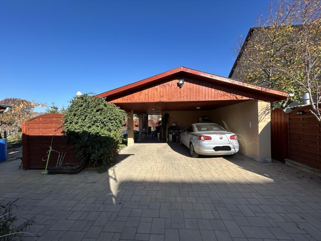 Az udvaron két autó számára fedett beálló biztosított, mögötte két külön tárolóval.
