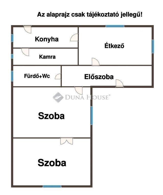 A helyiségek jelenlegi kialakítása 2 szoba,előszoba,étkező,konyha,kamra,fürdő+wc.