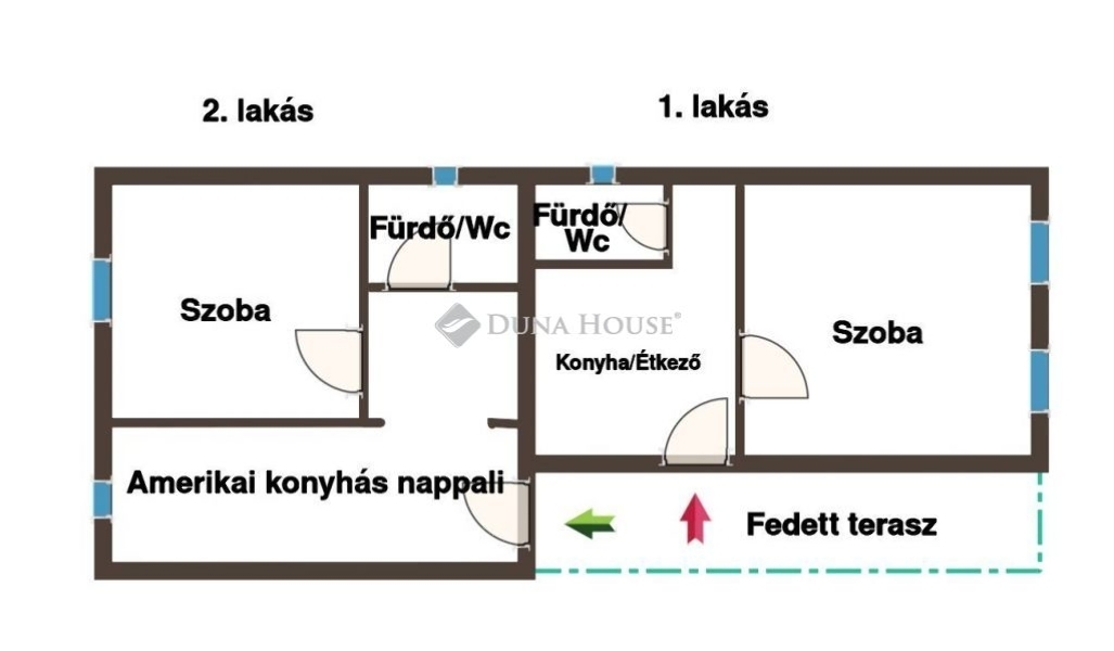 Az első lakás (38 m2) felújítás alatt van, mely a fedett teraszról közelíthető megy. A konyha/étkezőbe lépünk be, szemben találjuk a fürdőszobát és jobbra a nagy szobát, mely akár 2 kisebb szobára is szétbontható.
