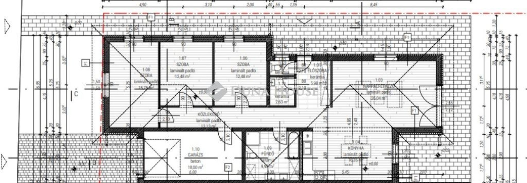 - 134,87 m2, amely: garázs + amerikai konyhás nappaliból, 3 szobából, fürdőszobából és külön WC.-ből áll.