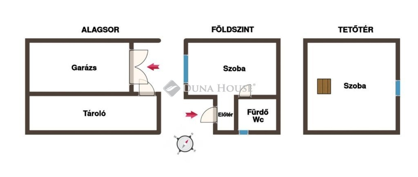 - A kis házban található egy szoba, fürdő-wc, előtér, beépíthető tetőtér, és egy alagsori szint szerelőaknás garázzsal és tárolóval.