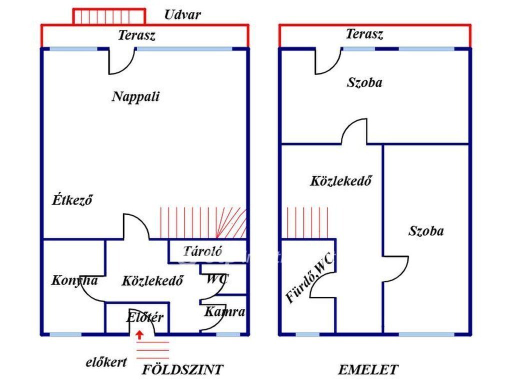 Emelet: 2 hálószoba (az egyik saját terasszal), fürdőszoba WC-vel