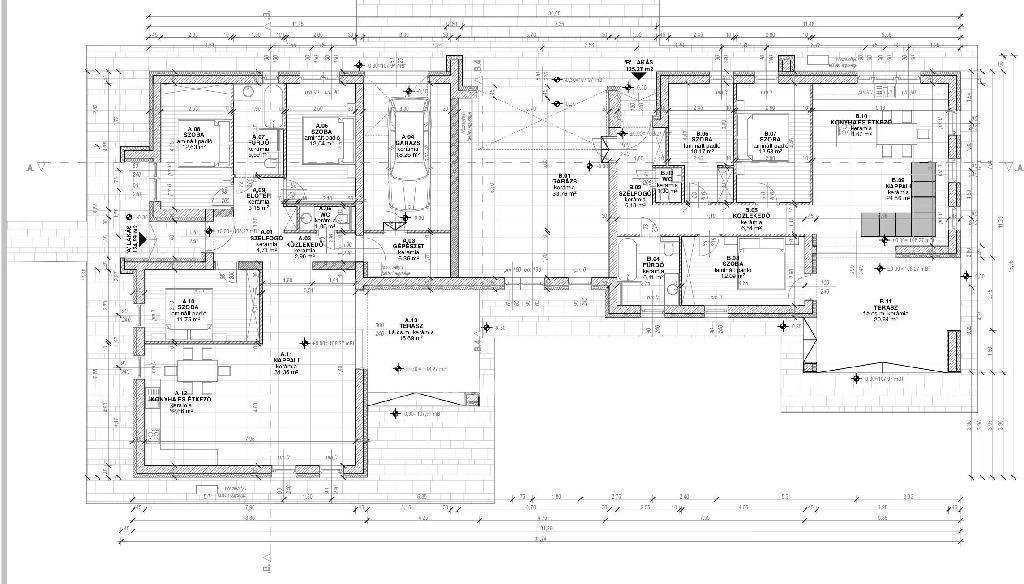 A belső terekben kerámia és laminált padlóburkolatok kerülnek kialakításra, a terasz fagyálló és csúszásmentes burkolattal készül. A tetőszerkezet minőségi fa ácsszerkezettel és betoncserepes fedéssel valósul meg, korszerű hő és páratechnikai rétegrenddel. A kivitelezés során kizárólag jól ismert, prémium minőségű gyártók anyagai kerülnek beépítésre, többek között Baumit, Austrotherm, Mapei és Rockwool termékek, amelyek garantálják az épület tartósságát, megbízhatóságát és hosszú élettartamát.