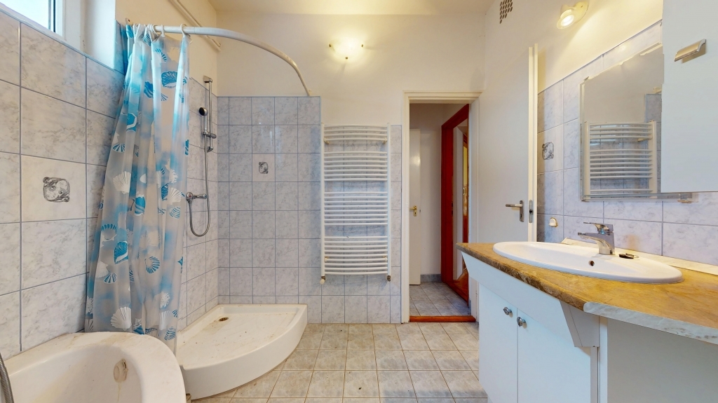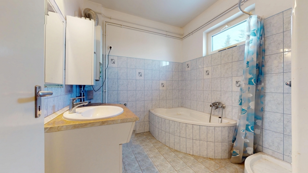 -Fürdőszoba sarokkáddal és zuhanyzóval