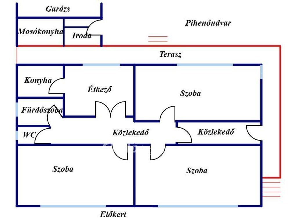 A lakótér praktikus és élhető elrendezésű: három különnyíló hálószoba, konyha, külön étkező, kamra, fürdőszoba zuhanyzóval és sarokkáddal is felszerelt, a WC külön helyiségben kapott helyet, körbefutó terasz ideális helyszín a pihenésre, a ház alatt pedig egy kisebb pince is rendelkezésre áll.