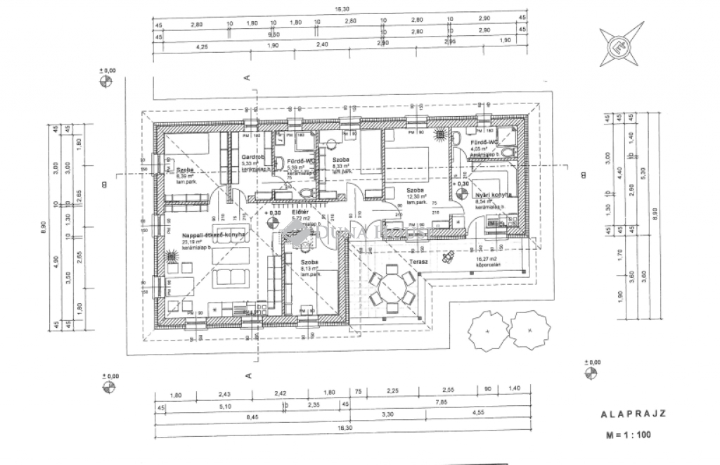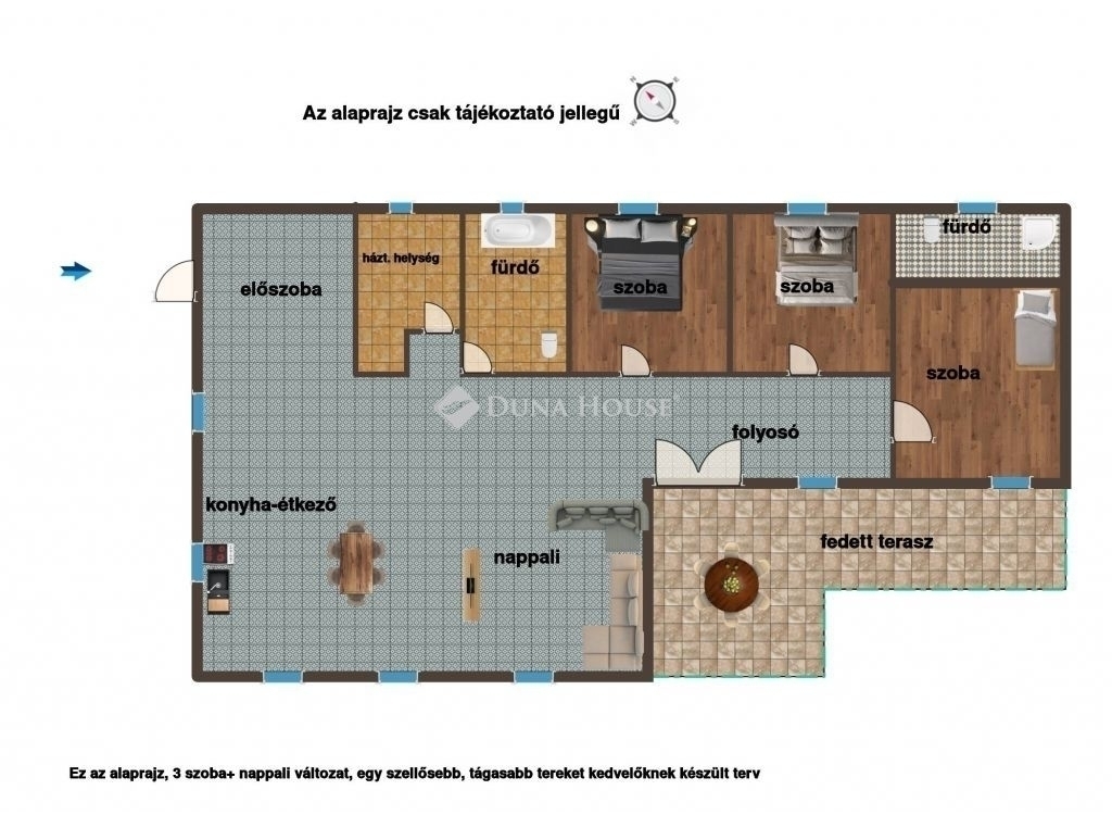 A ház fűtött hasznos lapterülete 91,37 m2, melyhez 16,27m2 fedett terasz tartozik. A belső elrendezés, válaszfalak még változtathatók az egyedi igényekhez igazodva. Jelenleg 4 hálószoba ,1 nappali-étkező, 2 fürdőszoba, 1 háztartási helység és egy nyári konyha tartozik. A belső elrendezés változtatható. Aki a tágasabb tereket kedveli, annak készült egy 3 szoba+ nappaliból álló terv is. A tetőszerkezetet úgy készítették, hogy ez a terv is megvalósulhasson.