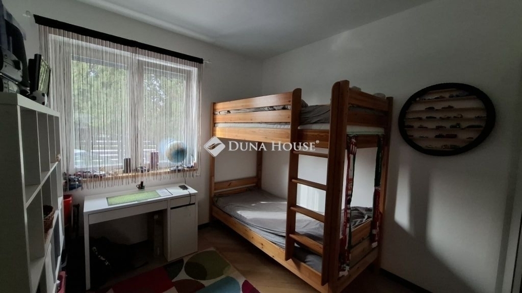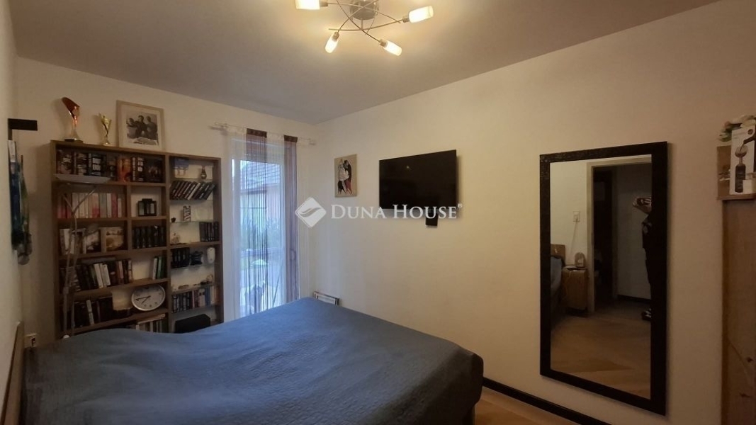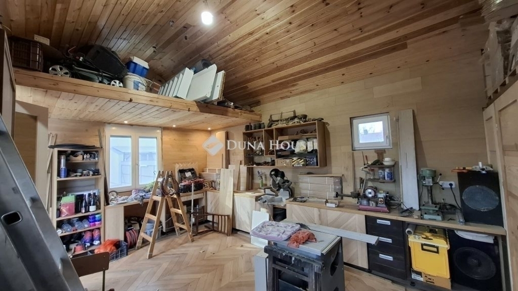 Az 572 nm-es telek részben térkövezett, részben füvesített, így kényelmes és esztétikus életteret biztosít. A kert végében kialakított konyhakertben szőlő, málna, áfonya és több gyümölcsfa is megtalálható, az öntözés pedig fúrt kútról megoldott. Az udvaron egy körülbelül 24 nm-es, árammal és vízzel ellátott kisház is helyet kapott, amely fa burkolattal, lambériával és galériával kialakított, így akár vendégházként, irodaként vagy hobbihelyiségként is használható. A mosogatóval ellátott épített kerti grillező ideális helyszíne lehet családi és baráti összejöveteleknek, a kert hátsó részében pedig további két tároló is rendelkezésre áll.