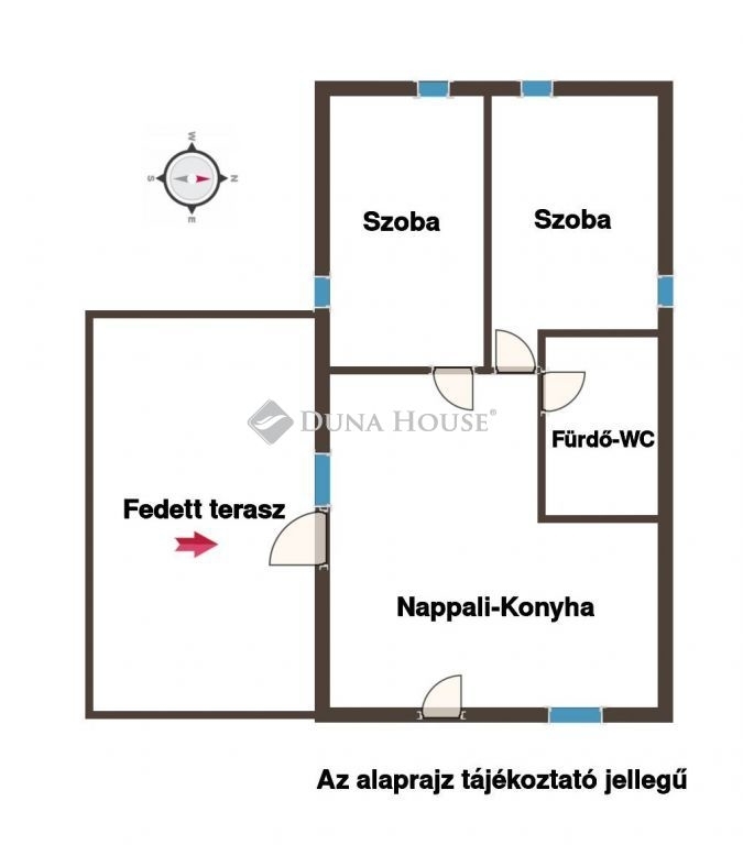 A földszintes ingatlan nettó 40 m², jól kihasználható elrendezéssel: nappali + 2 szoba.