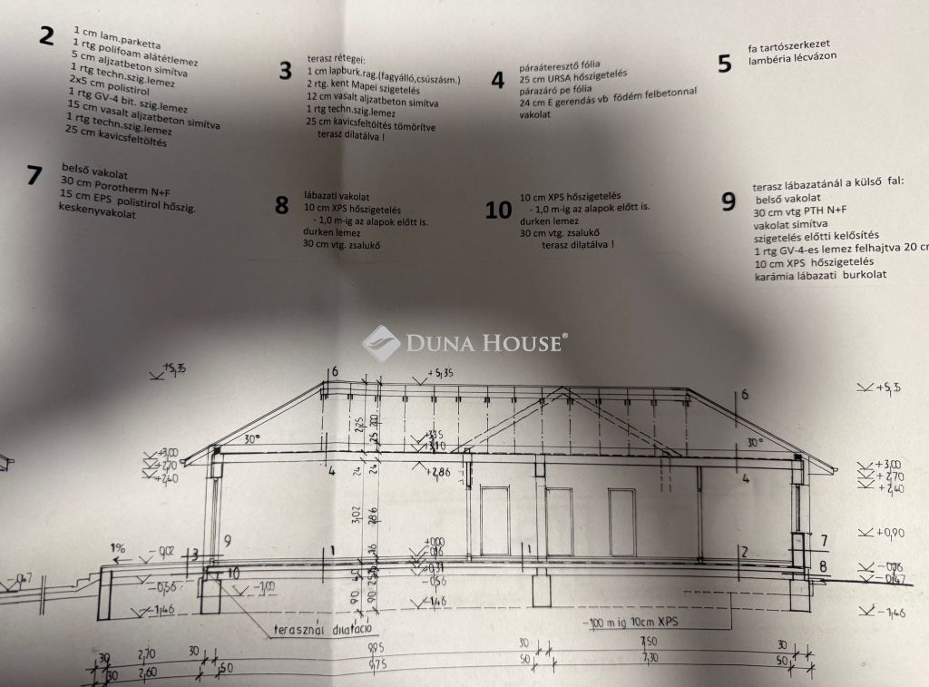A műszaki tartalom magas színvonalú. Az alap 90 cm mély és 50 cm széles sávalap, 12-es betonvassal. A főfal Porotherm 30 N+F téglából épül, a válaszfal 10 cm-es tégla. A födém betongerendás, a szarufák megfelelően kialakítottak, a tetőt cserépfedés borítja, a födémszigetelés 20 cm ásványi szálas hőszigetelésből készül, az energetikai előírásoknak megfelelően. A villanyszerelés 1x32 A, a falhornyokba elhelyezett műanyag csövekben futó vezetékek, riasztó előkészítés, internet- és kábel TV-csatlakozás található a hálószobákban és a nappaliban. A fűtést padlófűtés biztosítja, kiegészítve egy 10 kW-os hőszivattyúval. A műanyag nyílászárók fehér kivitelűek, 5 légkamrás német profil, háromrétegű üvegezéssel. A homlokzat 12 cm grafitos hőszigetelést kapott, a nemesvakolat 1,5-es szemcsenagyságú, világos színkódig.
