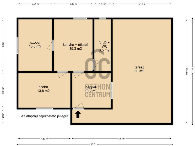 2 szoba, nappali, konyha-étkező, fürdő-Wc, valamint egy 50 m²-es fedett terasz.
