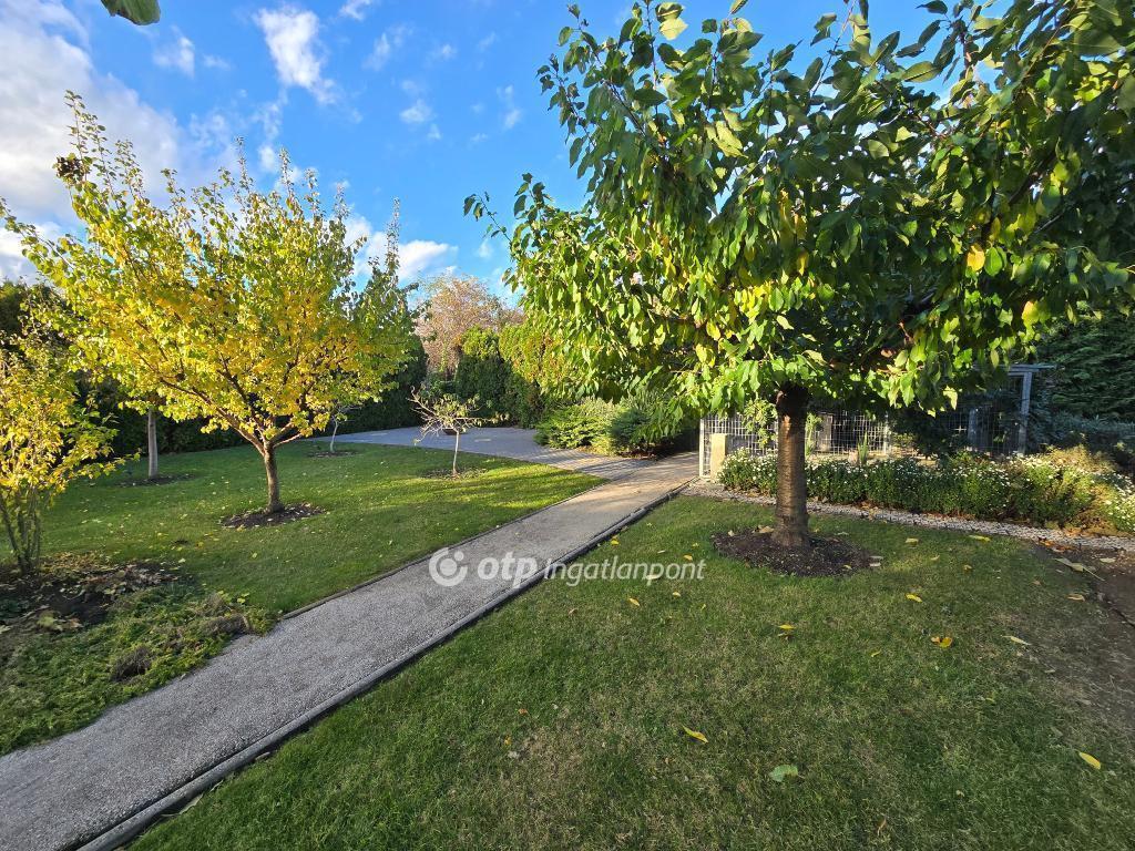 A 2449 m2-es telek a ház igazi ékköve, mérnöki precizitással megtervezett és szeretettel gondozott kert, ahol a dísznövények és egzotikus fák különleges harmóniát teremtenek. Az előkertben árnyas fák és ligetes rész fogadja a látogatót, míg a ház mögött mediterrán hangulatú udvar tárul fel pálmafával, banánfákkal, barack-, cseresznye-, körte- és fügefákkal, valamint citromfűvel, mentával, zsályával, eperrel és datolyával. A növényzet öntözését fúrt kútról működő, 7 zónás automata öntözőrendszer biztosítja.