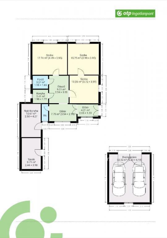 Az ingatlan elosztása praktikus és családbarát: három szoba, konyha, étkező, előszoba, társalgó, fürdőszoba és külön WC alkotja a belső részt. A házhoz tartozik továbbá egy 32 m2-es, beton aljzatú duplagarázs, egy nyárikonyha és egy külső tároló is, amelyek növelik az ingatlan értékét és sokoldalúan használhatók.