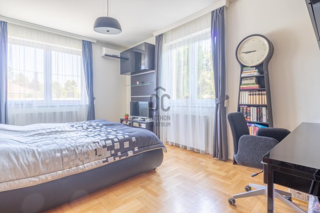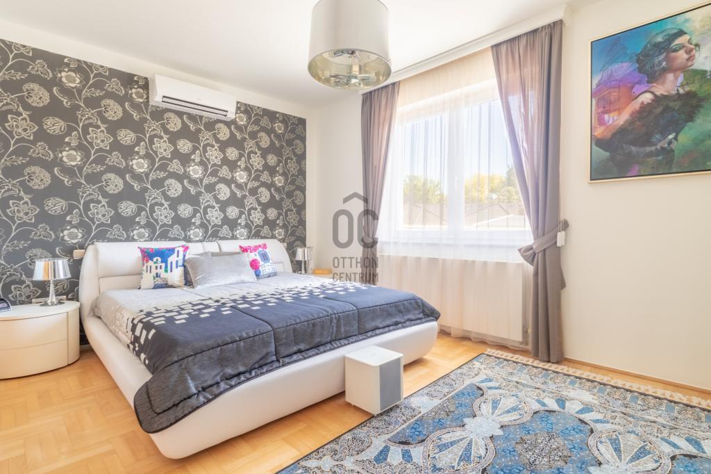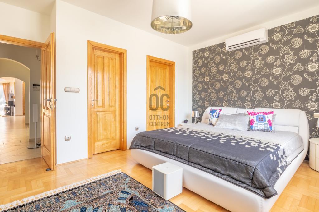 - Bal oldalon helyezkedik el szülői hálószoba, gardróbbal, külön fürdőszobával, továbbá három szoba és egy fürdőszoba mellékhelyiséggel, így biztosítva a család teljes nyugalmát.