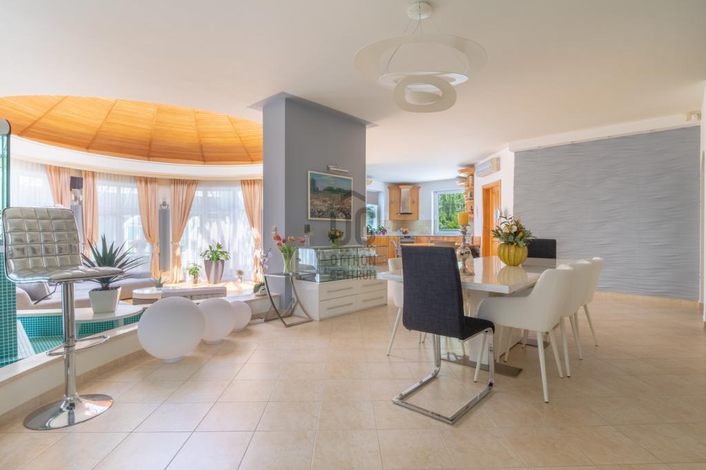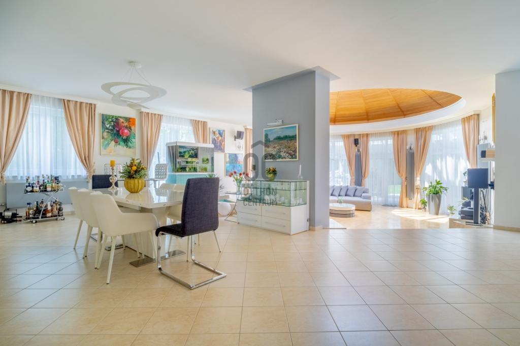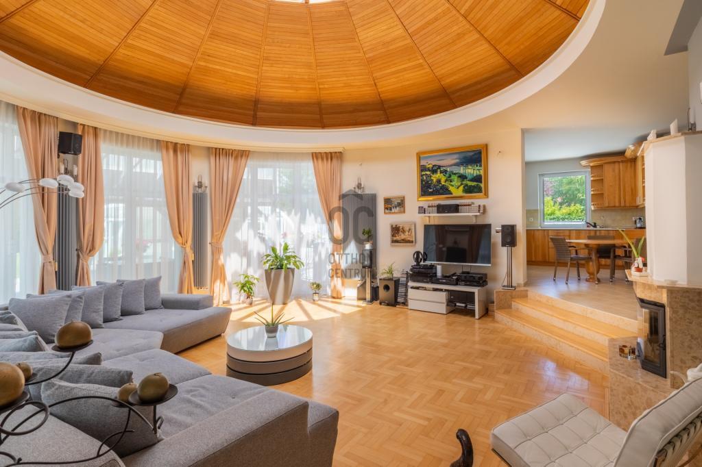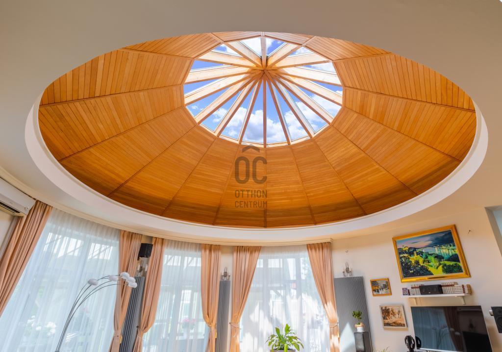 - Jobb oldalon a ház központi része, a közel 90 m2-es, egész nap FÉNYÁRBAN ÚSZÓ amerikai konyhás nappali és étkező található, ahol egy különleges építészeti megoldással kialakított FELÜLVILÁGÍTÓ KUPOLA természetes fénnyel árasztja el a helyiséget, továbbá egy szoba is megtalálható.