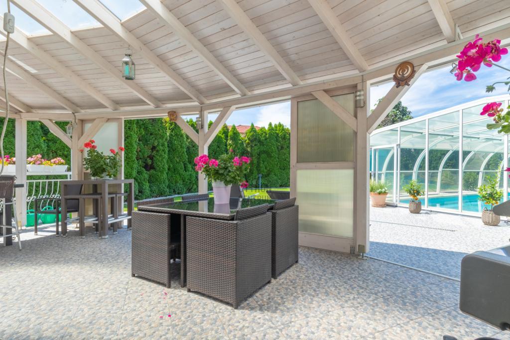 - FEDETT TERASZ medence és kert kapcsolattal.