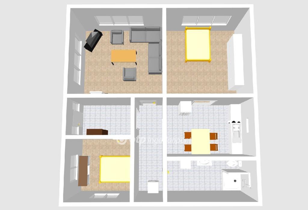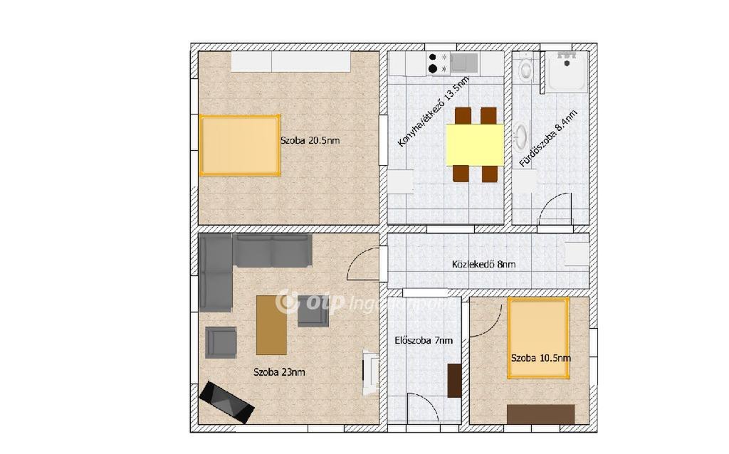 Elosztása nappali, két különnyíló hálószoba, konyha/étkező, fürdőszoba, közlekedő és előszoba.