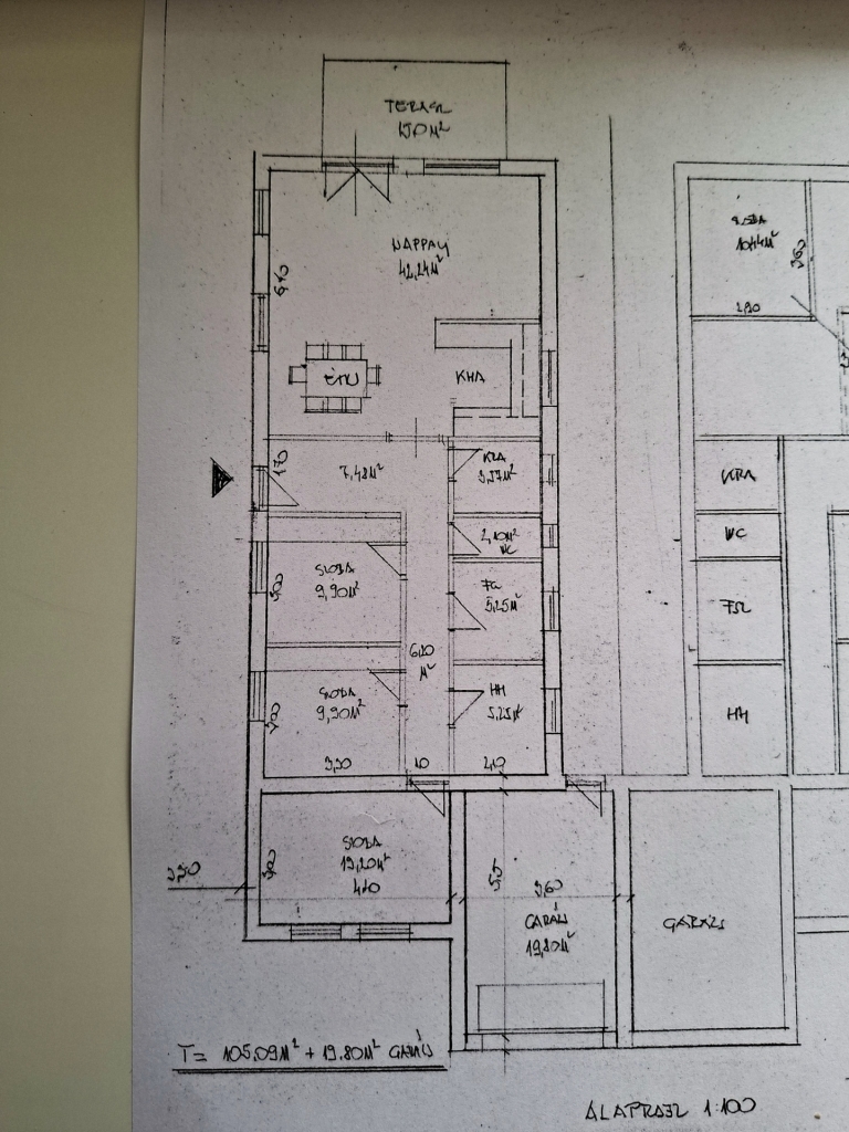 Helyiségek: amerikai konyhás nappali, 3 hálószoba, fürdőszoba, külön WC, előszoba, közlekedő, háztartási helység, kamra