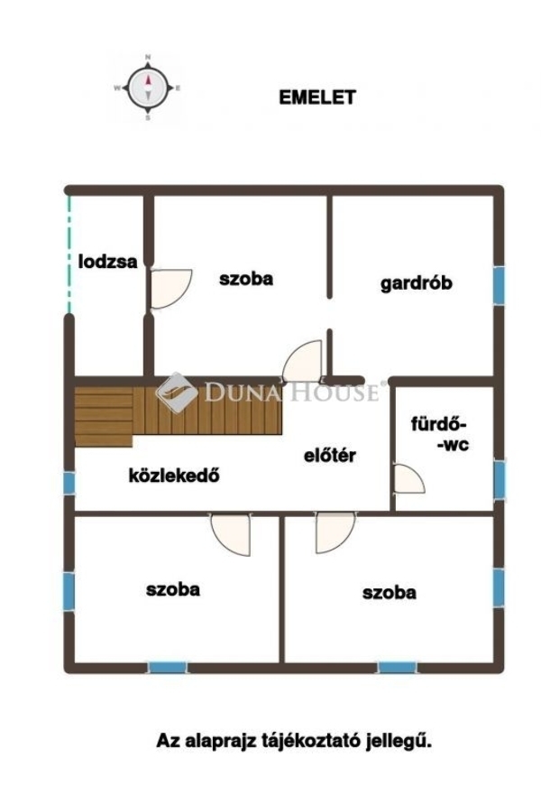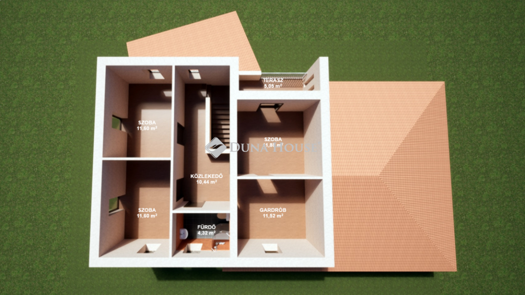 A felső szinten 3 db 12 nm-es szoba, fürdőszoba wc-vel és egy 12 nm-es gardrób szoba található. Utóbbiban kapott helyet az új gázkazán, továbbá egy infraszauna is.