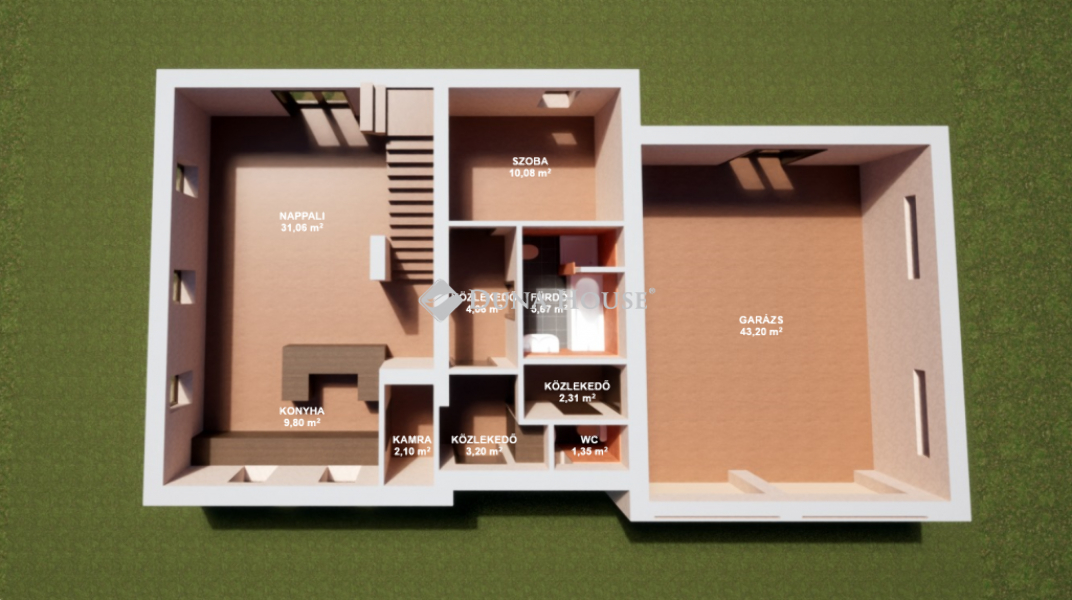 Az alsó szinten található az amerikai konyhás nappali-étkező, fürdőszoba, + külön wc, és egy 10 nm-es szoba. A nappaliból 40 nm-es, kertkapcsolatos terasz nyílik a hátsó udvarrész felé.