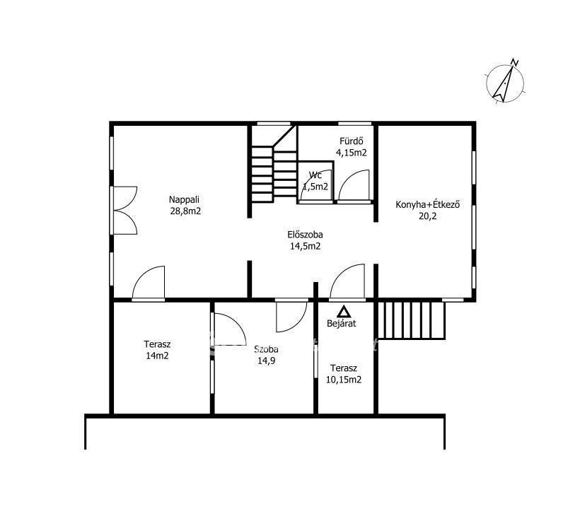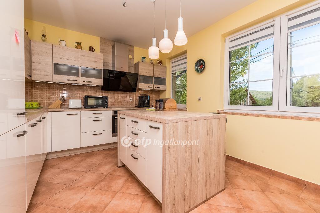 A bejárati szinten előszoba, tágas nappali, konyha?étkező, egy hálószoba, fürdőszoba és külön WC található. A nappaliból és a hálószobából nyíló teraszról, valamint a konyhából is lenyűgöző kilátás nyílik a pilisi tájra.