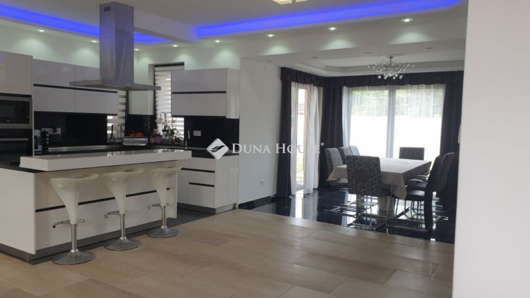 Piliscsabán Magdolna völgyben, lakóparki környezetbena Golgota utcában igazán igényesen megtervezett, Pilis hegységre örök panorámás, 1,187 m2-es telken elhelyezkedő, örökzöld fákkal körbevett, 2014-ben épült, 66 m2-es mediterrán típusú kis családi ház ELADÓ!A ház klimatizált, a fűtést elektromos panelek biztosítják, de a nappaliban elhelyezett kandalló is befűti az egész teret. A melegvíz ellátás villanybojlerrel történik. Az épület külső szigeteléssel ellátott és kiváló minőségű műanyag nyílászárókkal rendelkezik. A ház központi része a látványos 5 m belmagasságú, gerendás kialakítású, kertkapcsolatos, 34,55 m2-es nappali. A további 32 m2 magába foglal egy praktikusan elhelyezett, 13,35 m2-es, kertkapcsolatos hálószobát, zuhanyzós fürdőt wc-vel (6 m2), előszobát (3,15 m2) és konyhát (9,21 m2).A nappaliból kilépve, gyümölcsfákkal betelepített területre érünk, ahol megtalálható egy gerendákból épített ponyvával takart melléképület, amely jelenleg konditeremként szolgál, de kiválóan alkalmas egy kerti sütögető, bográcsozó, vendégfogadó hely kialakítására. Továbbá, kialakításra került egy igényesen megépített szerszámtároló faház, mely fém kerítéssel van körbevéve, ami kutyakennelként is használható. A kert és a gyümölcsfák öntözéséről egy profi módon kialakított fúrt kút gondoskodik. A kapubejárónál két autó parkolására alkalmas térköves terület, valamint egy fedett kocsibeálló található.Ajánlom mindenkinek, aki természethez közel szeretne élni és jelenleg ilyen jól kialakított kisházat keres. Az építési szabályoknak megfelelően és a telek adottságának köszönhetően, az épület 200 m2 alapterületig bővíthető. Piliscsaba város infrastruktúrája kedvező (óvodák, iskolák, bevásárló központ és orvosi ellátás).A közlekedés kiváló, autóval Budapest és Esztergom határa is 20 km-re található. Magdolna völgynek saját vasúti megállója van, ahonnan a Nyugati pályaudvar 35 perc alatt elérhető.Bővebb információért keressen bizalommal a hét bármely napján.