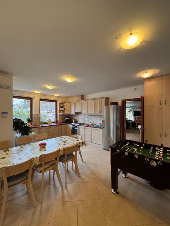 A 200 m-es alsó szinten két konyha, két fürdőszoba és tágas közösségi terek találhatók. A belső terekben olasz és spanyol burkolatok, minőségi anyagok dominálnak. A 70 m-es fagerendás fedett terasz nagyobb családi események tökéletes helyszíne.