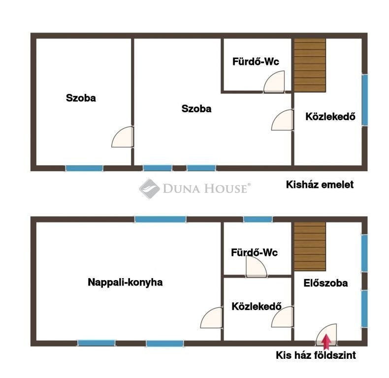 KIS HÁZ : a kisebbik családi ház két szintes, dupla fürdőszobával rendelkezik! Alsó -és felső szinten is elhelyeztek egy-egy fürdőszobát WC-vel.