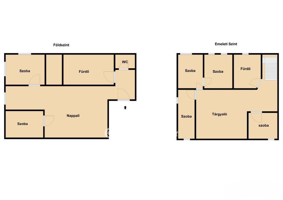 A főbejárati ajtó egy 10 m2-es előszobába vezet, ahonnan mindkét szint közvetlenül elérhető. Az előszobából továbbá egy kis gardrób, egy mosdó WC-vel, valamint egy tároló is nyílik. Alsó szint elrendezése: Tágas amerikai konyhás nappali étkezővel (40 m2 és 12 m2) Konyhából nyíló kamra (3 m2) Kisszoba (10 m2) Hálószoba (18 m2) a hátsó hegyoldal felé néz, biztosítva a nyugalmat és nyáron a kellemes hűvöst. Kényelmes méretű fürdőszoba (12 m2) fürdőkáddal és diszkréten elválasztott WC-vel. A konyhából ajtó vezet a hátsó teraszra, ahonnan lenyűgöző kilátás tárul elénk Felső szint elrendezése: Déli fekvésű, napfényes konyha-étkező (30 m2), ahonnan csodálatos panoráma nyílik a szemközti hegyekre Négy hálószoba (12 m2, 10 m2, 15 m2 és 12 m2) Fürdőszoba fürdőkáddal és WC-vel (10 m2).