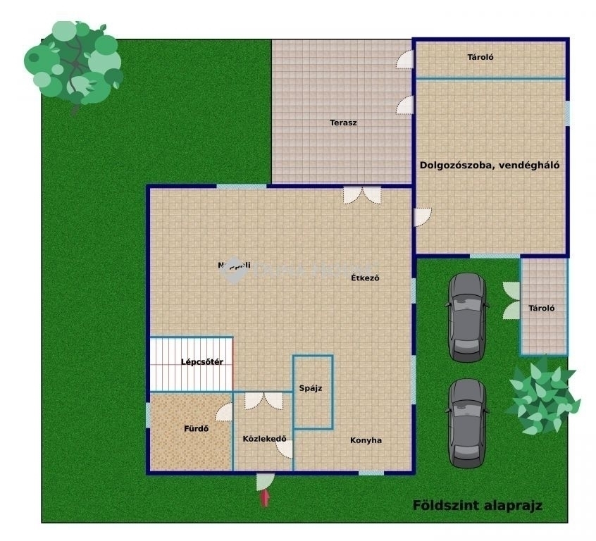 Egy különálló 3 nm-es tárolót pedig a bicikliknek lett kialakítva. Két autóbeálló zalálható a ház mellett. ( Bár az utcában átmenő forgalom az ingatlant követően egyáltalán nincs.)